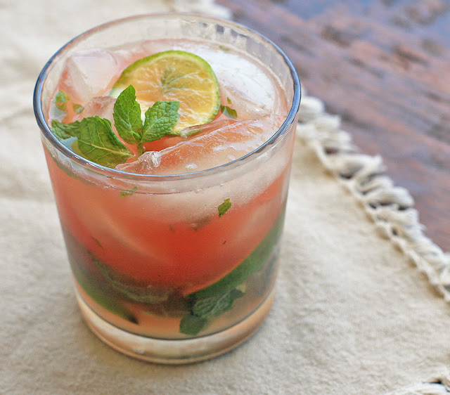 I’m already making good on #3. Watermelon has been a staple around here lately. When I saw a recipe for watermelon mojitos, I knew I had to try it. The Mexican mojito from two weeks ago was so good, I figured adding some fresh fruit could only make it better. I was right. It’s light and refreshing with a pretty pink hue to boot. But be careful- it goes down nice and easy but packs quite a punch.